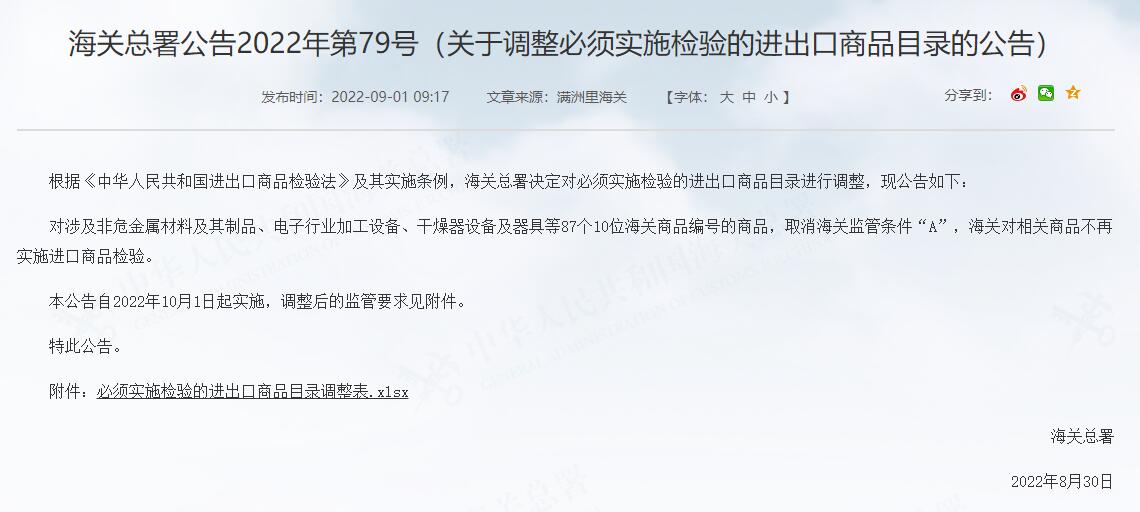 海關(guān)總署公告2022年第79號(關(guān)于調(diào)整必須實施檢驗的進出口商品目錄的公告)