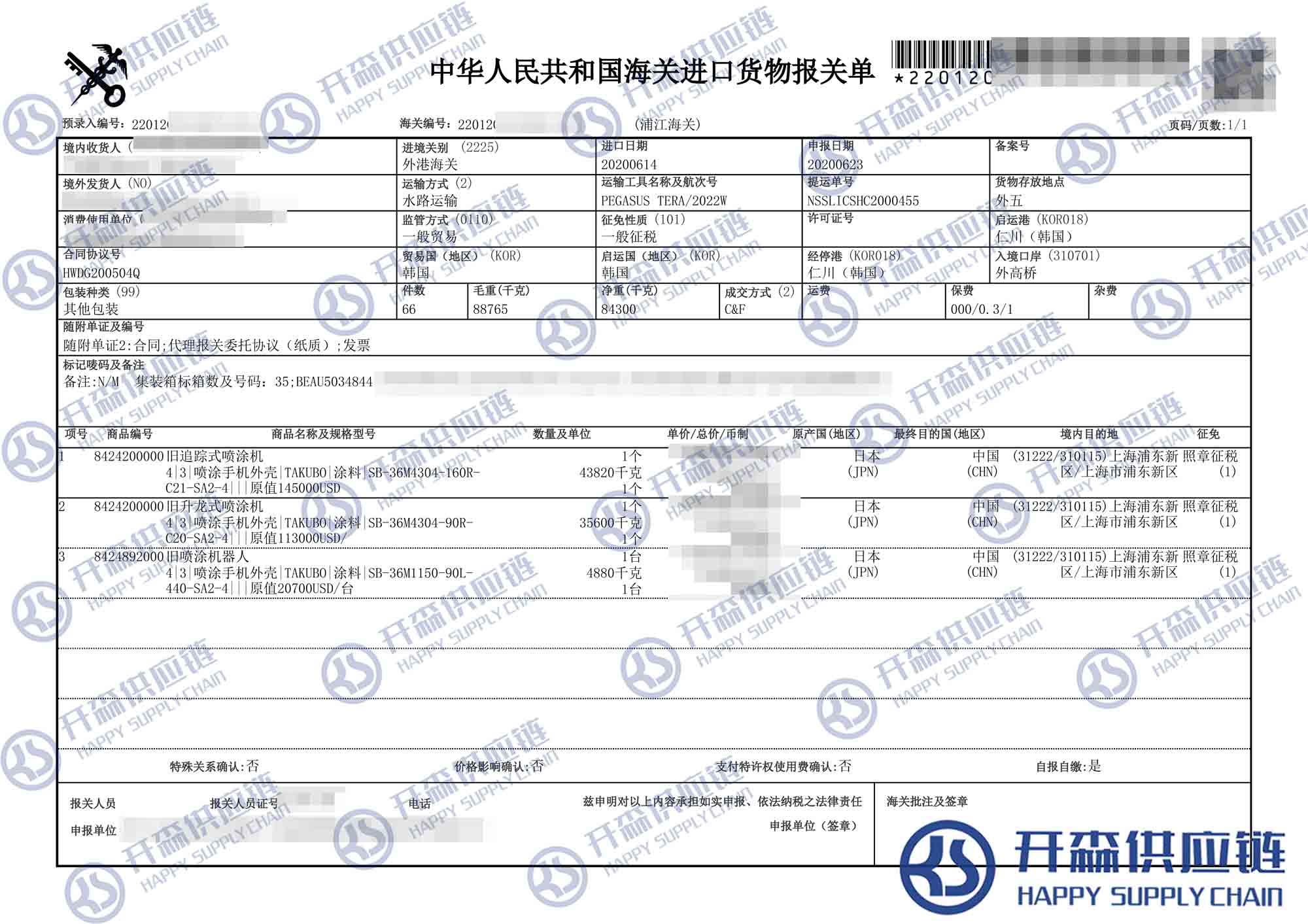 上海港韓國舊追蹤式噴涂機(jī)進(jìn)口報關(guān)代理【進(jìn)口案例】