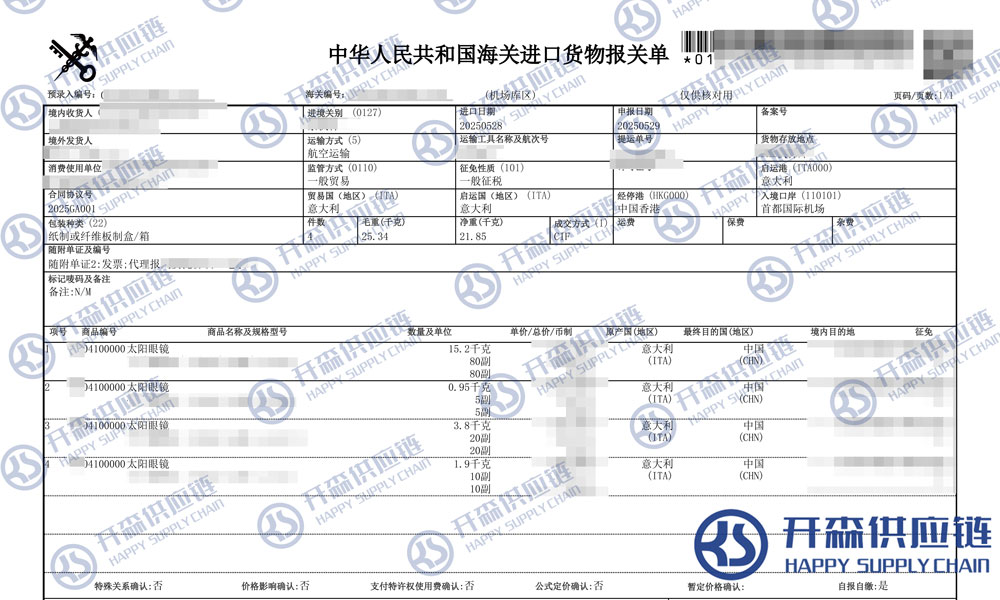 上述就是北京機場太陽眼鏡進口報關(guān)代理服務(wù)【清關(guān)案例】的全部內(nèi)容,希望能對您有所幫助,如有進口報關(guān),進口報關(guān)代理公司,進口報關(guān)代理上任何疑問及問題可隨時在線聯(lián)系我們或撥打 18002611553,開森供應(yīng)鏈擁有豐富的進口報關(guān),進口報關(guān)代理公司,進口報關(guān)代理操作經(jīng)驗及案例,10余年進口經(jīng)驗為您所用,各類進口疑難都能為您一一解答及協(xié)助快速處理解決!